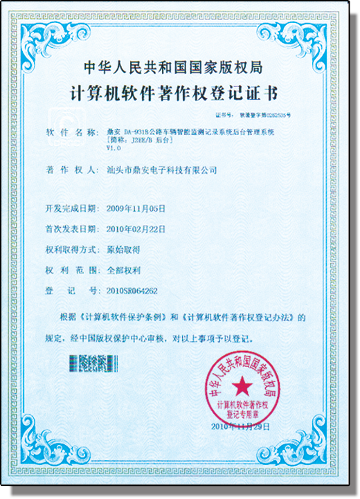 DA-931后平臺數(shù)據(jù)管理系統(tǒng)嚴(yán)格按照GA/T 497-2009《公路車輛智能監(jiān)測記錄系統(tǒng)通用技術(shù)條件》、《廣東省治安卡口視頻監(jiān)控系統(tǒng)建設(shè)規(guī)范》、GA/T 496–2009《闖紅燈自動記錄系統(tǒng)通用技術(shù)條件》等相關(guān)公共安全行業(yè)標(biāo)準(zhǔn),對整個系統(tǒng)建設(shè)進(jìn)行了詳細(xì)規(guī)劃設(shè)計,充分體現(xiàn)出安全、實用、合理、易維護(hù)等特點。該系統(tǒng)已得到國家版權(quán)局計算機(jī)軟件著作登記權(quán)證書(軟著登字第0252535號)。